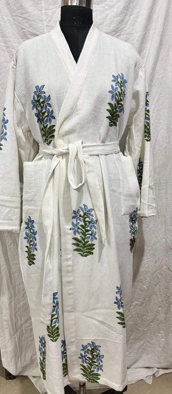 Wrap yourself in comfort and artisanal charm with our Block Print Cotton Waffle Robe. Crafted from 100% breathable cotton in a textured waffle weave, this robe offers lightweight warmth and exceptional softness—perfect for year-round lounging.