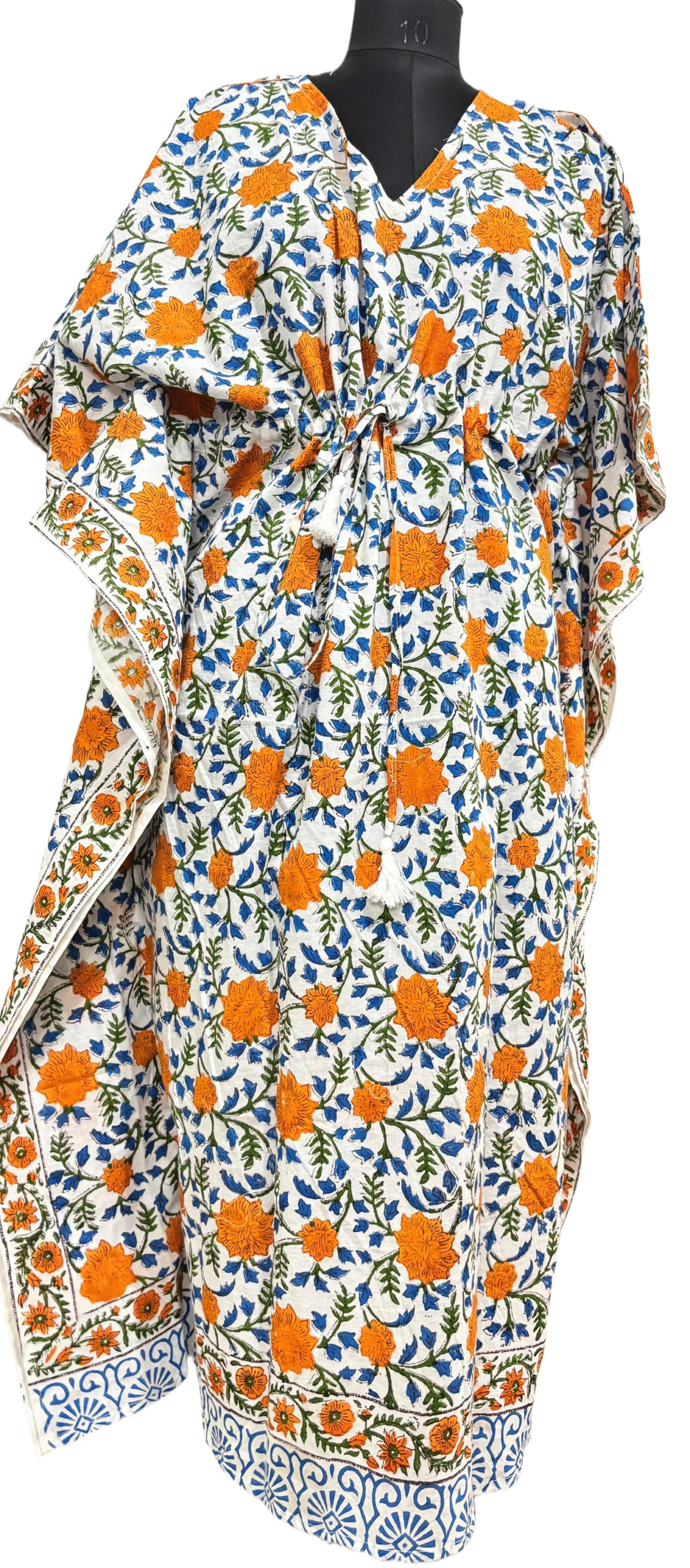 Perfect for lounging at home, beachside strolls, or casual evenings out, the kaftan includes a flattering V-neckline, side slits for ease of movement, and wide sleeves for a breezy fit. Each piece is individually hand-printed by skilled artisans, making every kaftan one-of-a-kind