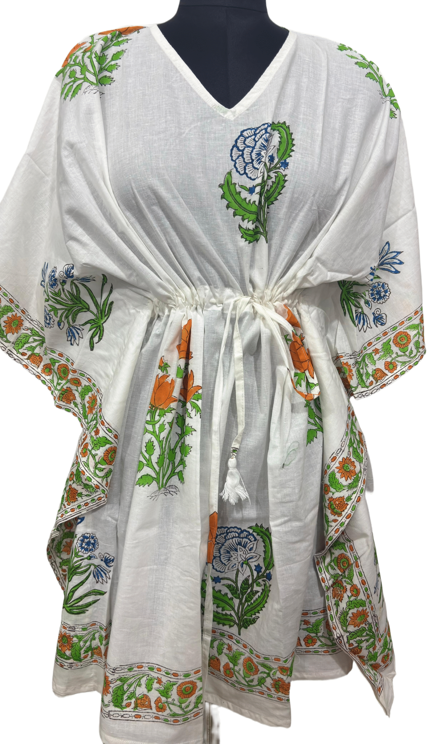 Perfect for lounging at home, beachside strolls, or casual evenings out, the kaftan includes a flattering V-neckline, side slits for ease of movement, and wide sleeves for a breezy fit. Each piece is individually hand-printed by skilled artisans, making every kaftan one-of-a-kind