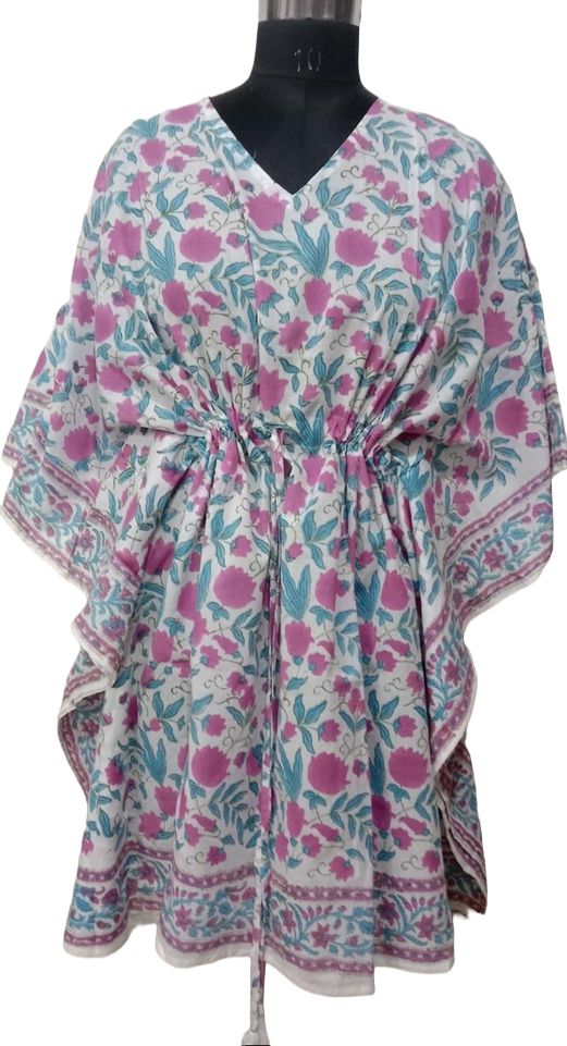 Perfect for lounging at home, beachside strolls, or casual evenings out, the kaftan includes a flattering V-neckline, side slits for ease of movement, and wide sleeves for a breezy fit. Each piece is individually hand-printed by skilled artisans, making every kaftan one-of-a-kind