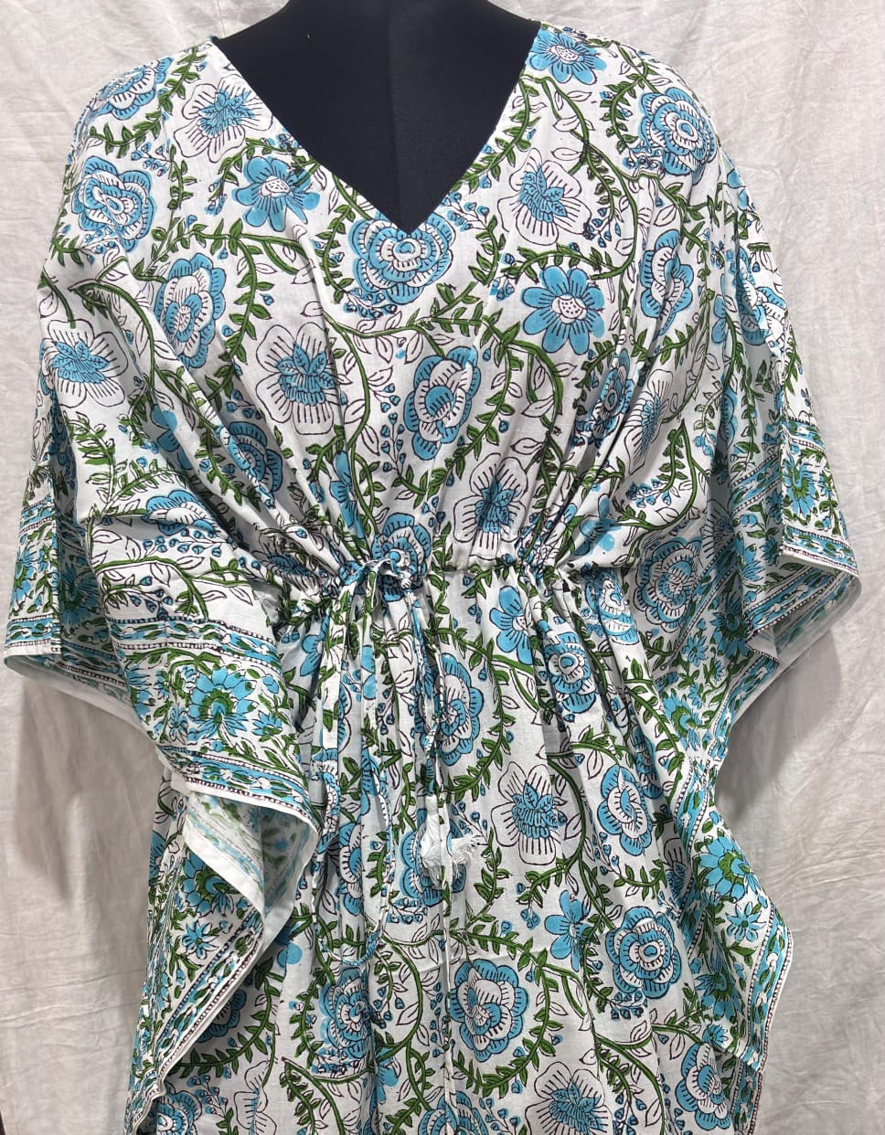 Perfect for lounging at home, beachside strolls, or casual evenings out, the kaftan includes a flattering V-neckline, side slits for ease of movement, and wide sleeves for a breezy fit. Each piece is individually hand-printed by skilled artisans, making every kaftan one-of-a-kind
