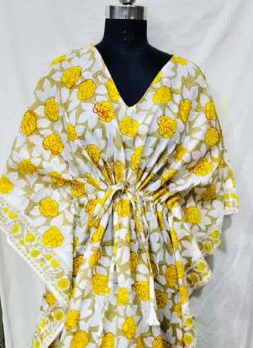 Perfect for lounging at home, beachside strolls, or casual evenings out, the kaftan includes a flattering V-neckline, side slits for ease of movement, and wide sleeves for a breezy fit. Each piece is individually hand-printed by skilled artisans, making every kaftan one-of-a-kind
