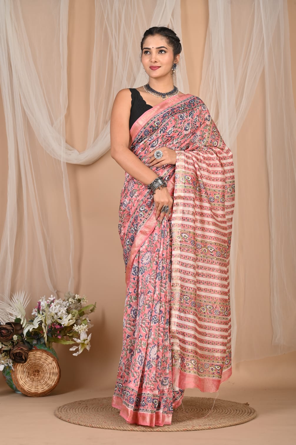 Design: Adorned with traditional hand block prints, each motif is stamped individually by skilled artisans using wooden blocks and natural dyes. The patterns reflect a harmony of nature-inspired designs and geometric symmetry, giving the saree a distinct and earthy charm.