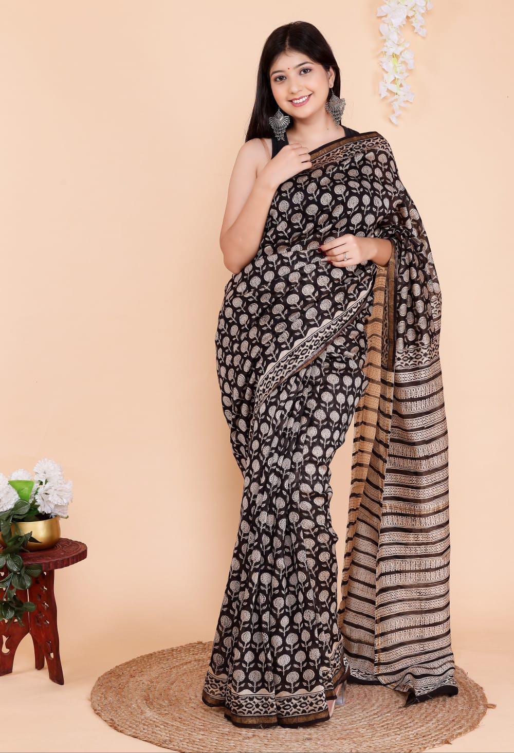 Adorned with intricate hand block prints, each motif tells a story of heritage and artistry. The natural dyes and detailed patterns showcase the precision of Indian hand-block printing techniques, making every piece unique. Whether you’re dressing up for a festive celebration, a wedding function, or a cultural gathering, this saree is sure to make a graceful statement.