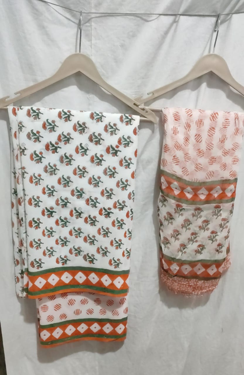 A hand-block print cotton suit with a cotton dupatta is a timeless blend of tradition and elegance. Crafted from soft, breathable cotton, this suit is adorned with intricate hand-block prints, showcasing the artistry of skilled craftsmen. The delicate motifs, inspired by nature and heritage patterns, are created using wooden blocks dipped in natural or eco-friendly dyes, ensuring a unique and sustainable fashion statement.