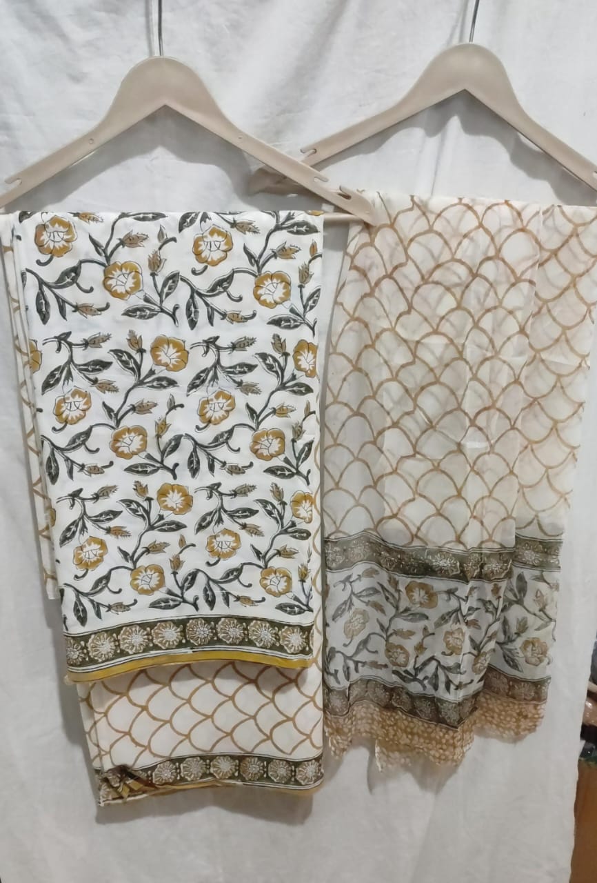 Hand Block Print Cotton Suit With Chiffon Dupatta