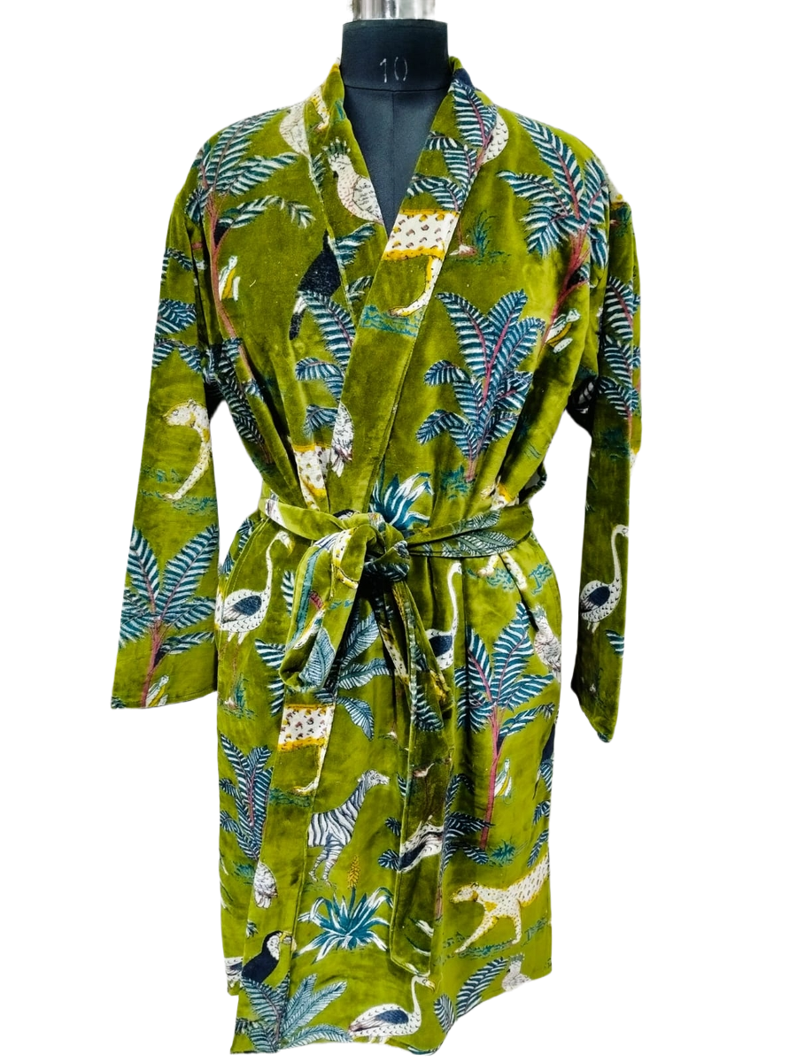 Wrap yourself in timeless comfort with our Jaipuri Print Cotton Velvet Robe. Crafted from soft cotton velvet, this robe features traditional Jaipur-inspired prints that celebrate rich Indian craftsmanship. The plush texture offers warmth and coziness, while the breathable cotton base ensures all-day comfort. Perfect for lounging, relaxing evenings, or adding a touch of elegance to your daily routine.