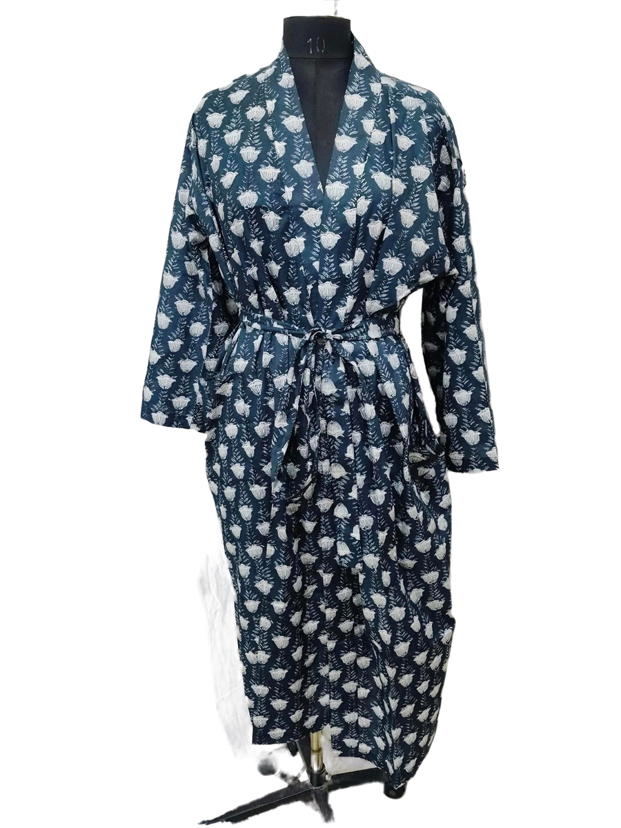 Wrap yourself in timeless elegance with this handcrafted Jaipuri print robe. Made from 100% soft cotton, it features intricate Jaipuri prints inspired by the rich heritage of Jaipur. Lightweight yet durable, this robe is perfect for lounging at home, spa days, or as a thoughtful gift.
