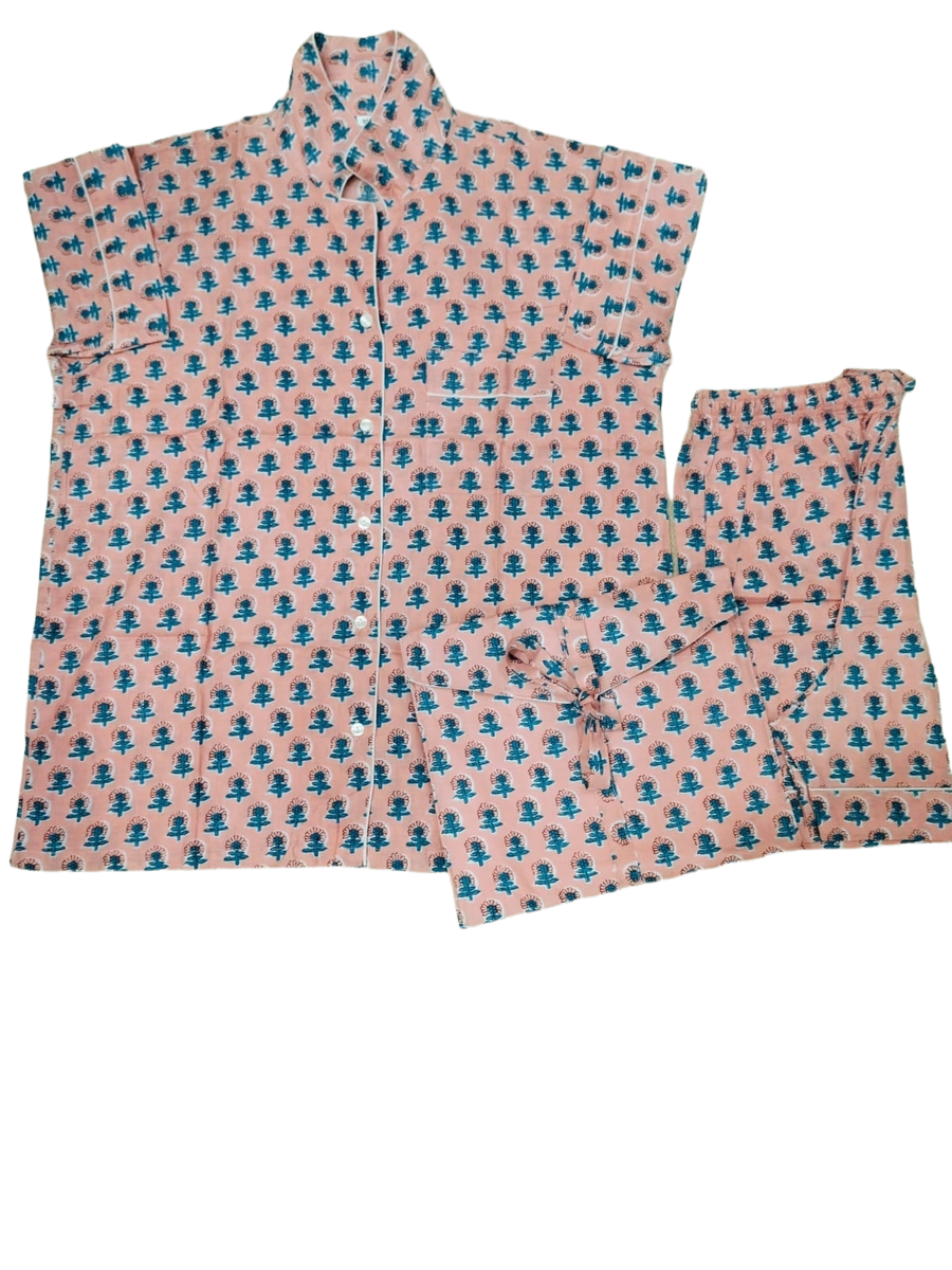 Featuring authentic Jaipuri prints, the set includes a short-sleeve top with a relaxed fit and a pair of matching shorts with an elastic waistband for all-night ease. The vibrant colors and intricate patterns reflect the rich heritage of Jaipur’s textile artistry, adding a touch of ethnic flair to your bedtime routine.
