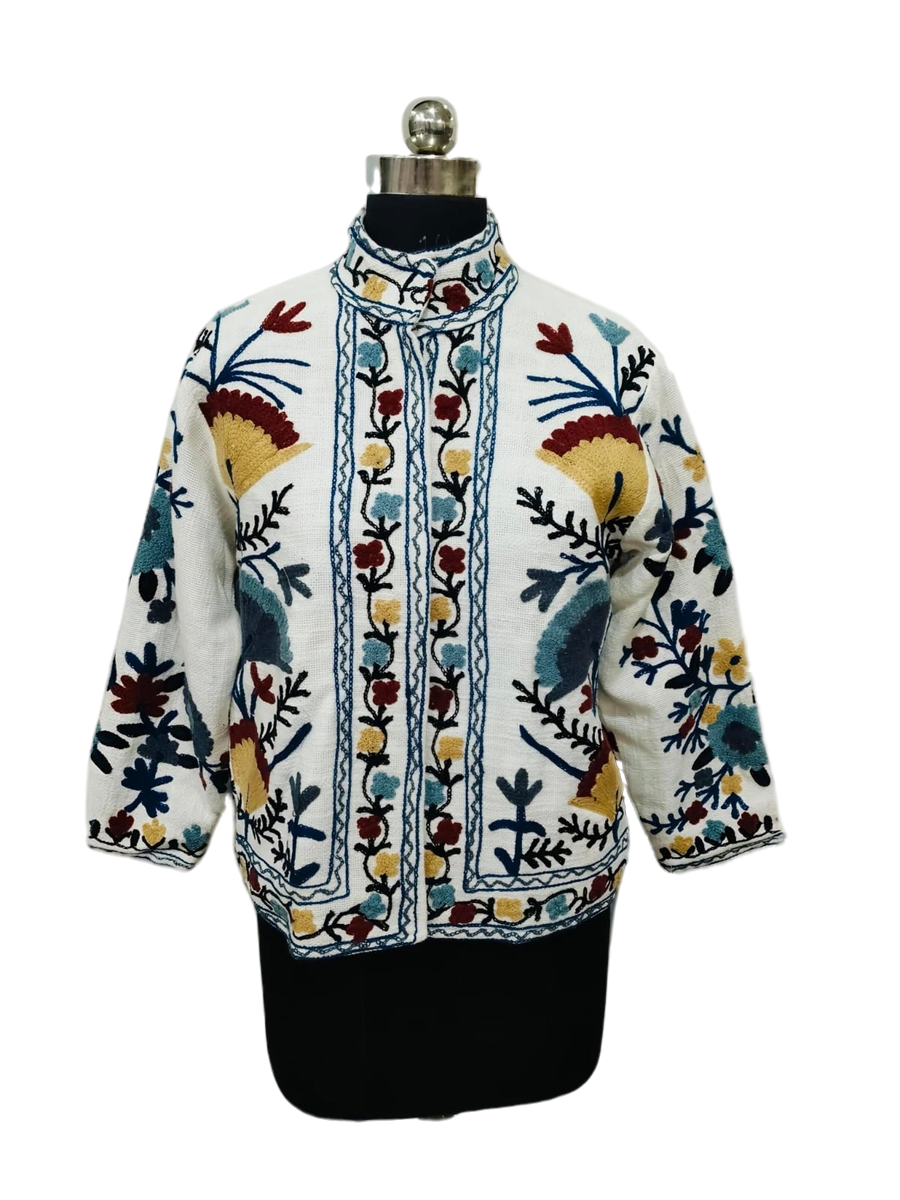 Elevate your wardrobe with the timeless charm of our Sujani Jacket, crafted from handwoven Khadi cotton. This jacket is a harmonious blend of traditional Indian textile art and modern minimalism, featuring Sujani embroidery – a heritage craft from Bihar known for its intricate, storytelling stitchwork.