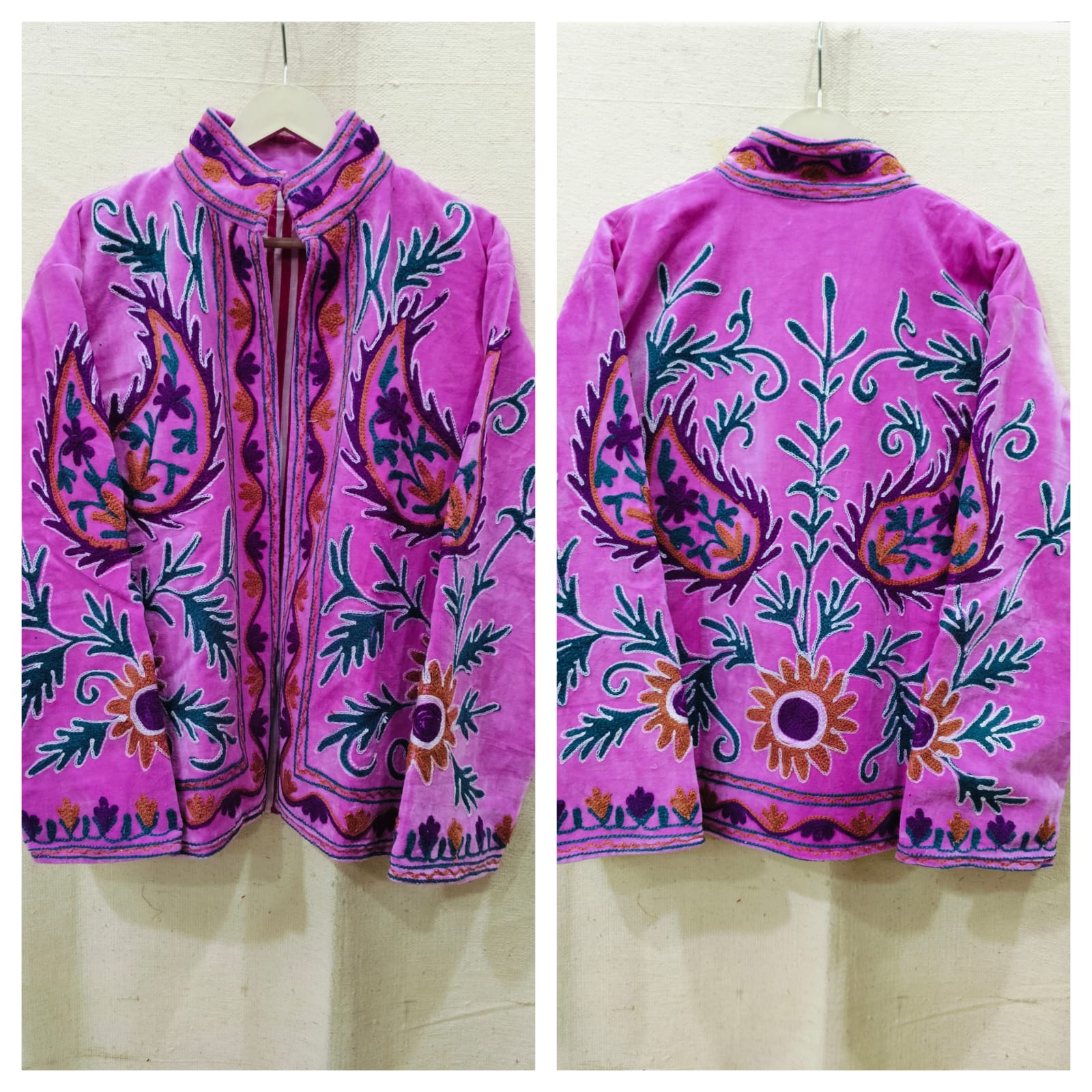 Wrap yourself in artisanal elegance with our Sujani Jacket, crafted from luxurious velvet cotton. Each piece features hand-stitched Sujani embroidery—an age-old Indian tradition that blends heritage and craftsmanship into wearable art. The soft velvet cotton fabric ensures comfort with a rich texture and natural warmth, perfect for layering through transitional seasons.