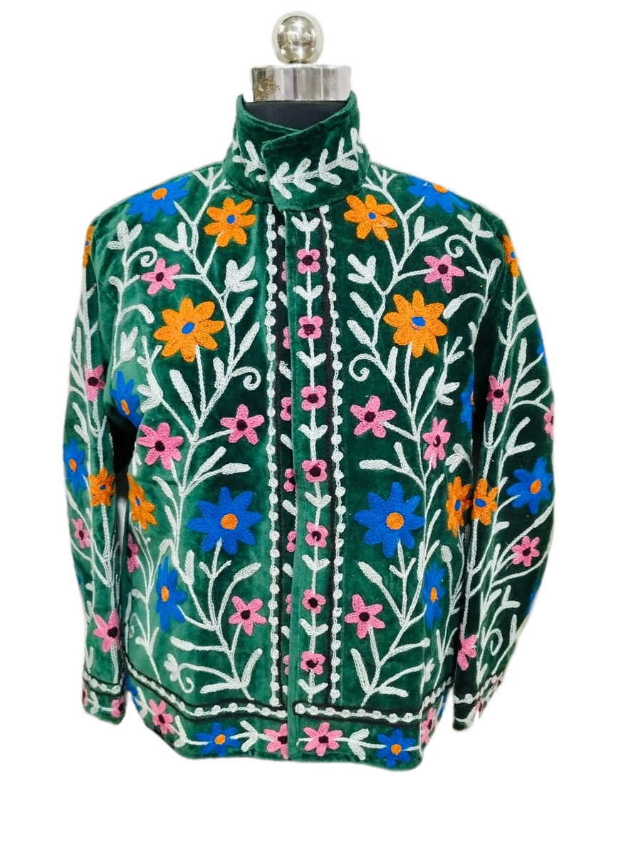 Wrap yourself in artisanal elegance with our Sujani Jacket, crafted from luxurious velvet cotton. Each piece features hand-stitched Sujani embroidery—an age-old Indian tradition that blends heritage and craftsmanship into wearable art. The soft velvet cotton fabric ensures comfort with a rich texture and natural warmth, perfect for layering through transitional seasons.